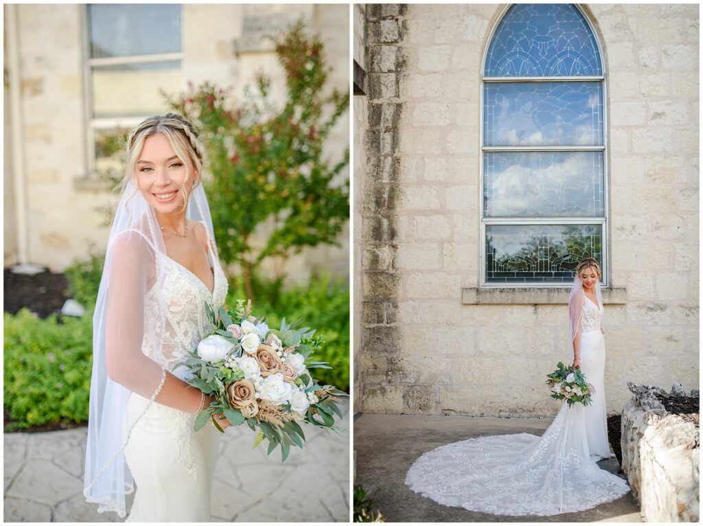 Some sessions feel like poetry in still frames — quiet, graceful, and full of light. Talyn’s bridal portraits at Sts. Peter and Paul Catholic Church in New Braunfels, Texas were exactly that. Between the limestone walls, arched windows, and soft Hill Country sky, everything about this afternoon felt timeless.
